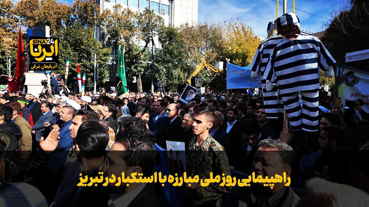 تبریز-ایرنا- راهپیمایی روز ملی مبارزه با استکبار همزمان با سراسر کشور با شرکت اقشار مختلف مردم به ویژه دانش آموزان در تبریز برگزار شد. شرکت کنندگان در این راهپیمایی اقدامات آمریکا و رژیم صهیونیستی را بر علیه کشورمان محکوم کردند، مراسم ۱۳ آبان امسال با یادی از دانش آموزان شهید جنگ ۱۲ روزه همراه بود.